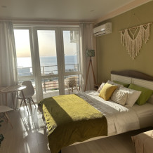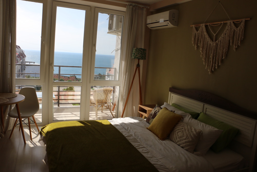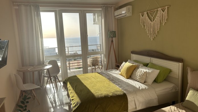 Апартаменты с прямым видом на море, с современным ремонтом в престижном комплексе. Из окна Вы увидите море и потрясающие закаты. Имеется все необходимое для проживания, от стиральной машины до вилок с ложками, посуда для еды и готовки.