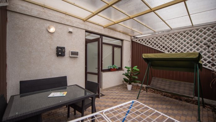 Таунхаус двухуровневый с собственной террасой, где расположена обеденная зона, качель.
