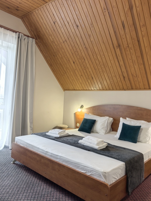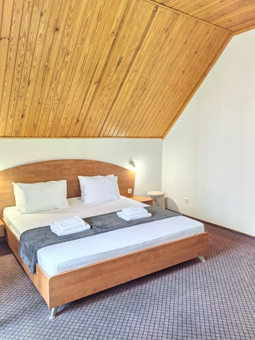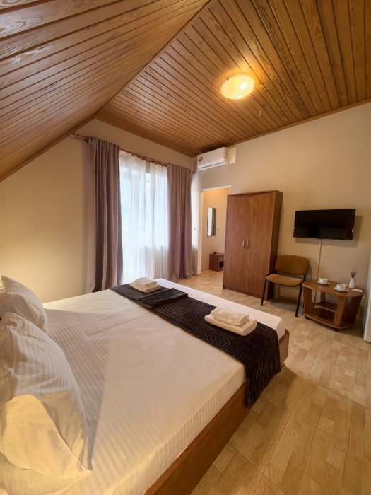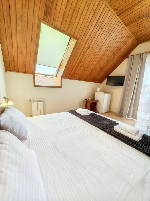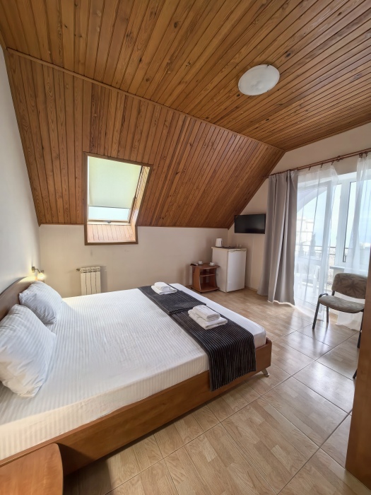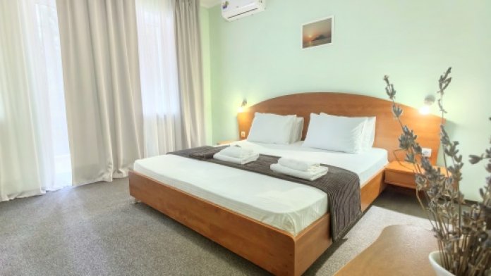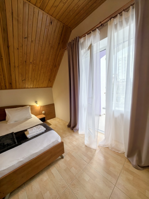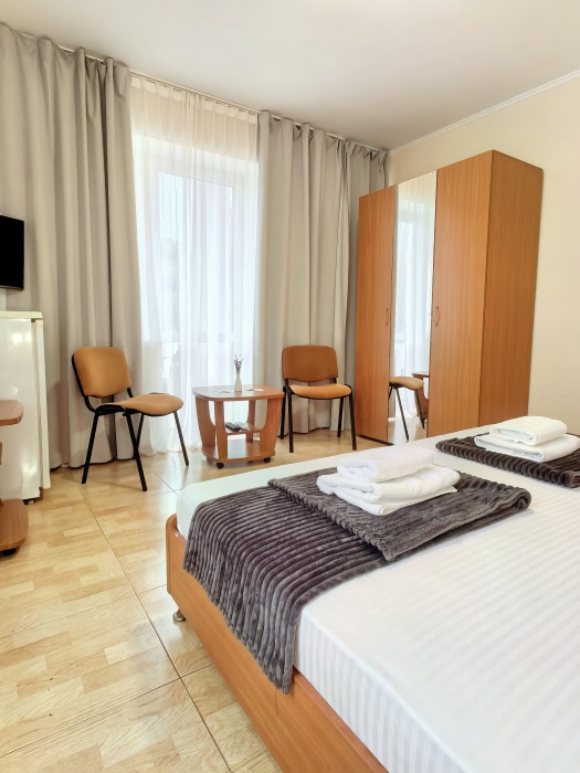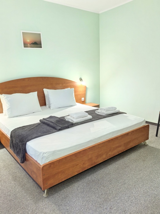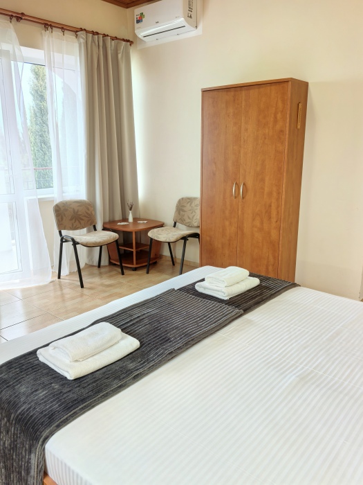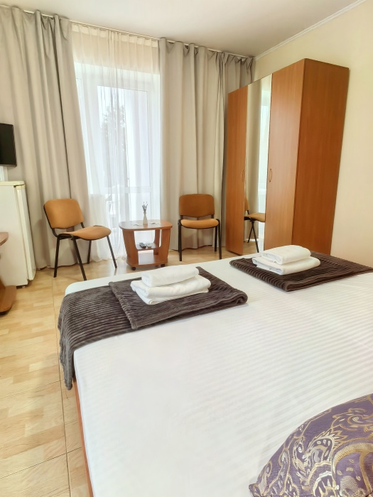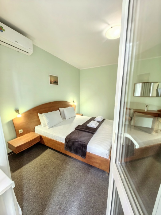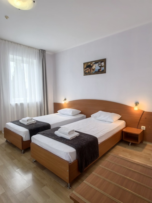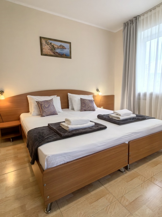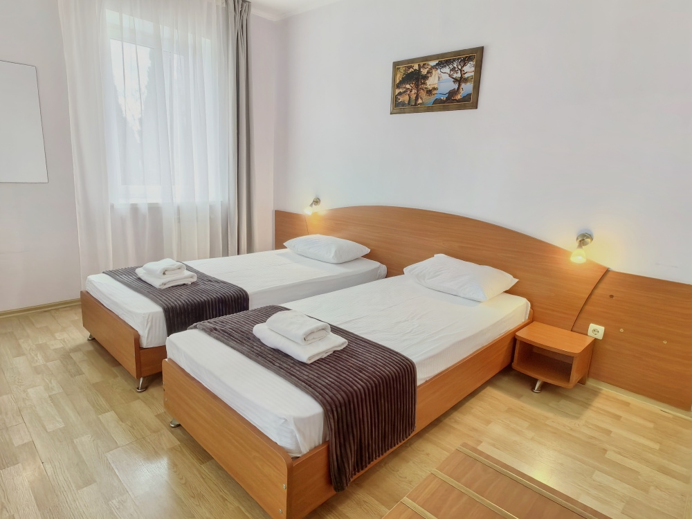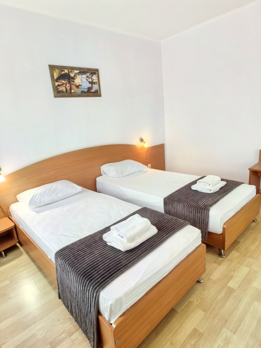 В номере двуспальная или две односпальные кровати на ваш выбор с выходом на свой балкон.