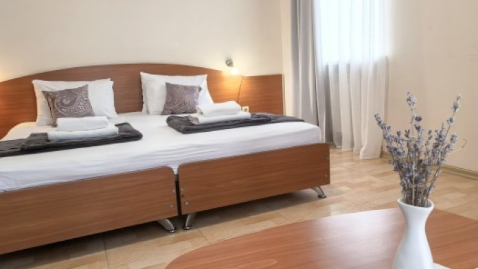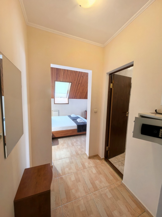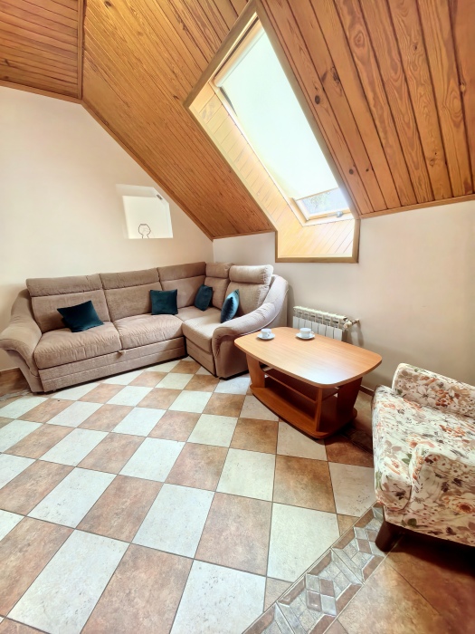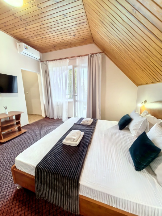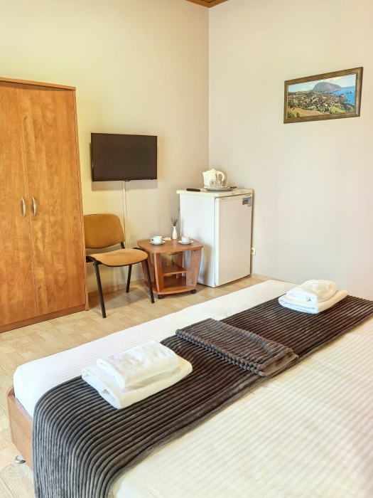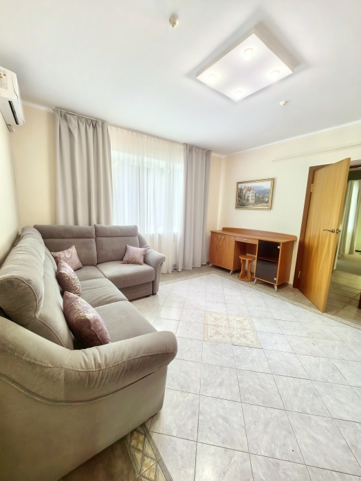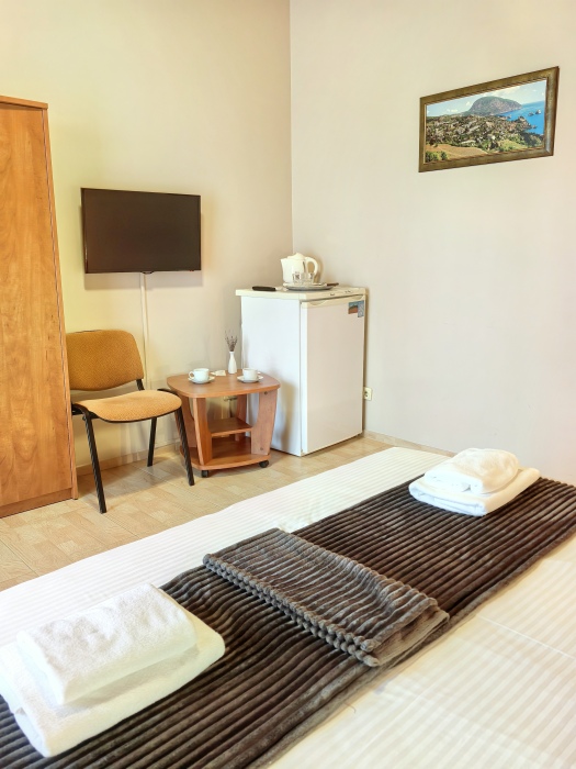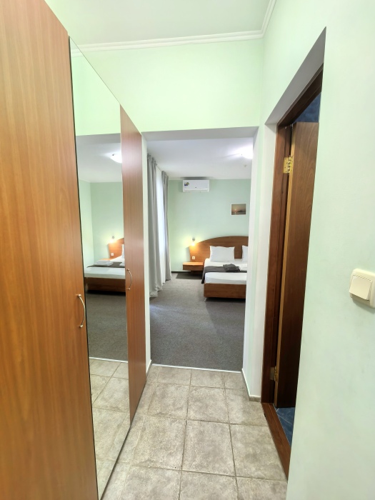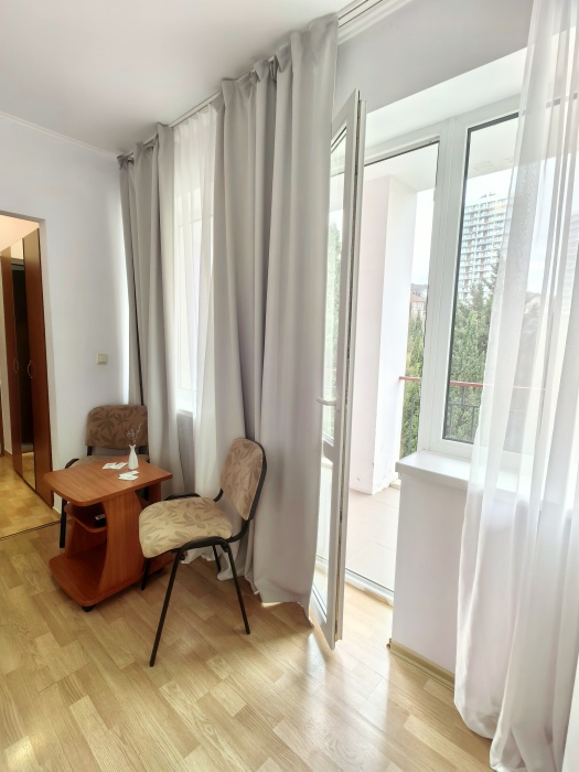 Одна комната – спальня с двуспальной кроватью, с выходом на свой балкон, во второй комнате находится раздвижной угловой диван.