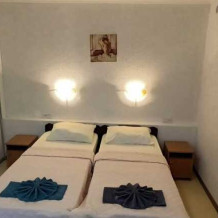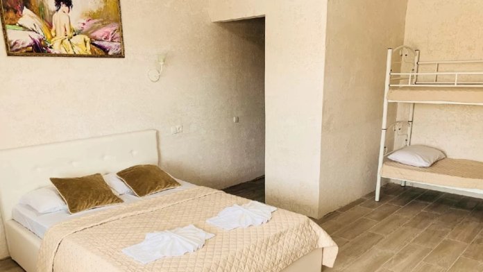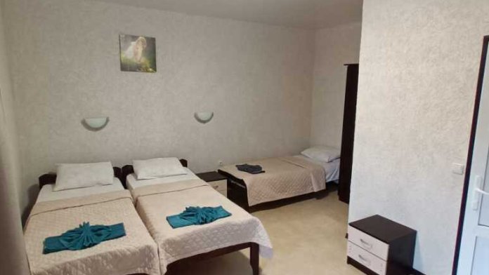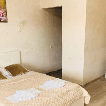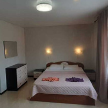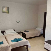 Однокомнатные номера на 1м и 2м этаже. Имеется общий балкон. В номере: двуспальная кровать, односпальная кровать, прикроватные тумбочки, шкаф, зеркало, телевизор, кондиционер, ванная комната, фен, полотенца, постельное бельё.