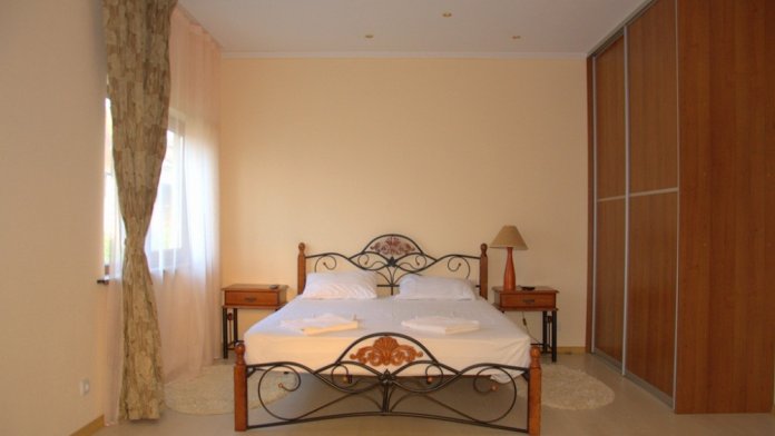 Отдельно стоящий двухэтажных дом. На 1 этаже с собственной зоной отдыха: беседка, мангал. На 2 этаже с видом на море, балкон 20 кв м, мебель, отдельный вход. Номер трёхкомнатный: кухня-гостиная с полным набором посуды, СВЧ, электроплита, чайник, двухкамерный холодильник, обеденный стол, кондиционер, smart TV, угловой раскладывающихся диван, шкаф купе. Две спальни: в одной двухспальная кровать, в другой - две односпальные. Санузел: унитаз, биде, умывальник, душ, шкаф, фен, гигиенические принадлежности, полотенца, халаты.