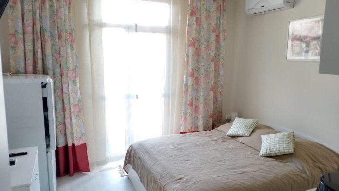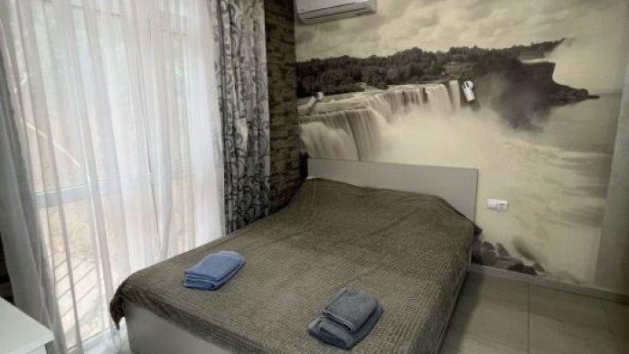 Небольшой уютный номер с полноценной кухней. В номере есть варочная поверхность, набор посуды, большой раскладной диван, балкон.