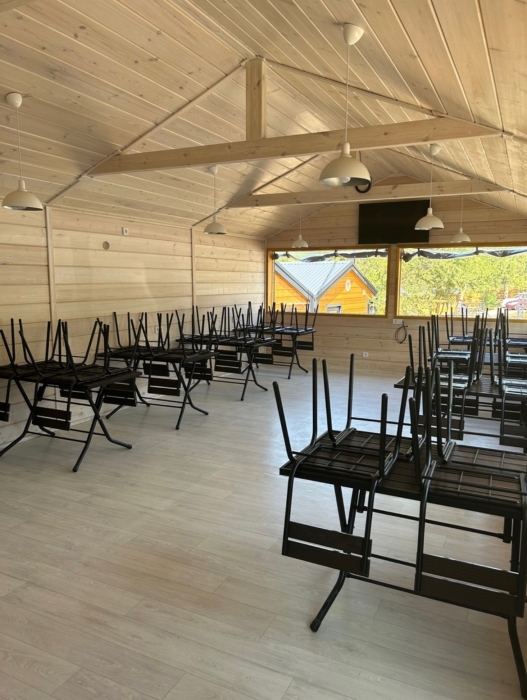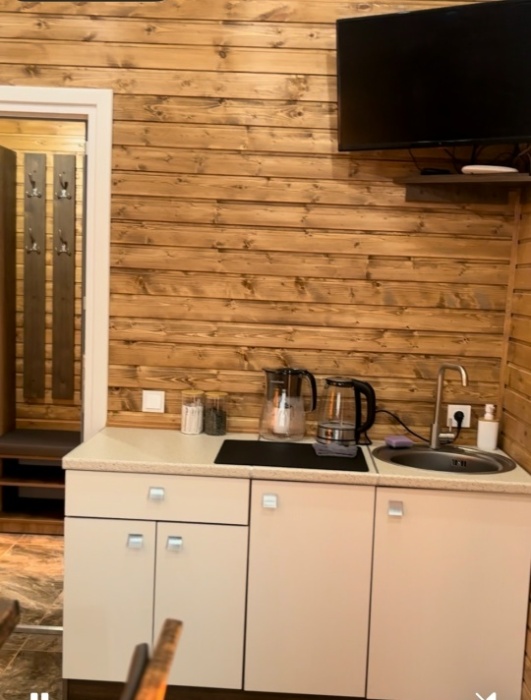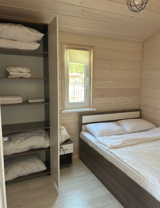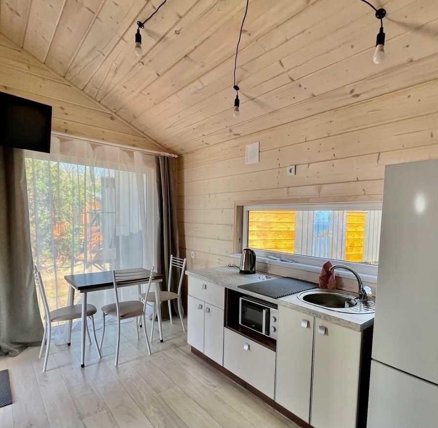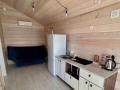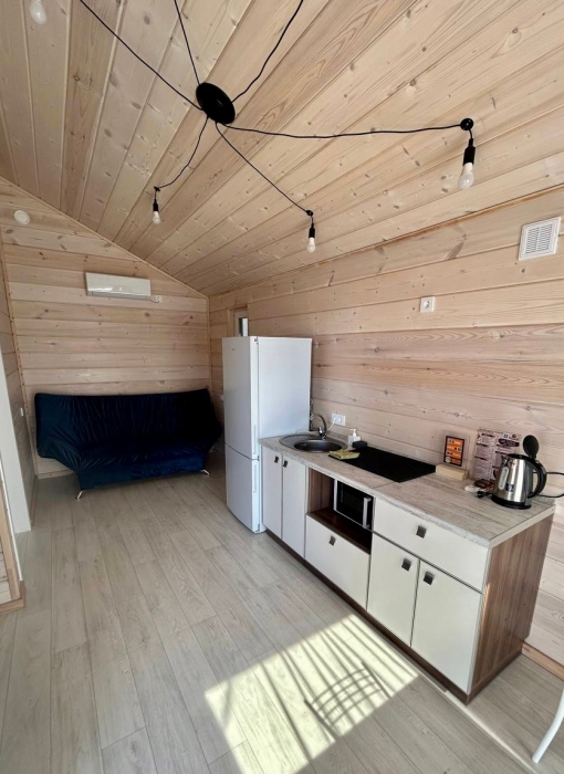 В каждом домике есть терраса, кондиционер, плазма, мини-кухня (холодильник, микроволновка, столешница с встроенной раковиной ), чайник, посуда, переносной стол и стулья, шкаф для вещей, гардеробная, постельное и полотенца.