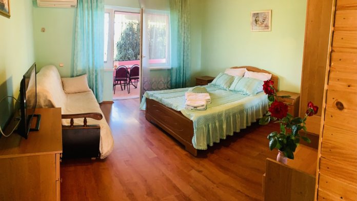 В номере просторная лоджия с видом на море, стол и стулья, шкаф для одежды, мини-кухня (посуда, электрочайник, микроволновая печь); в каждом номере санузел - душ, умывальник, туалет, бойлер, фен по запросу. Дополнительное место: кресло-кровать, раскладная кровать.