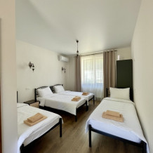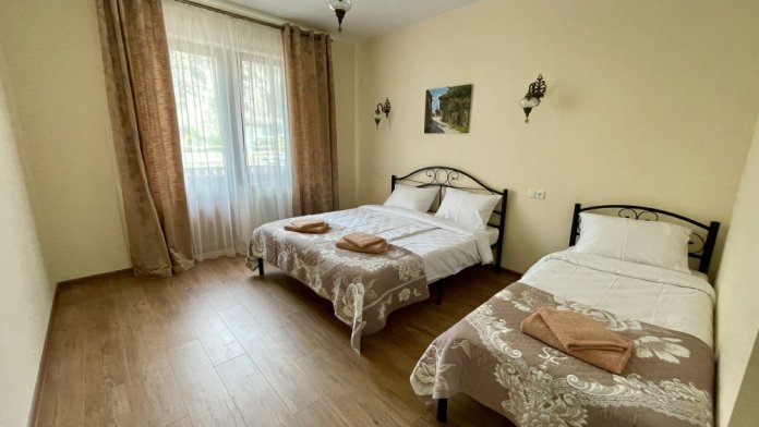 Кондиционер. Номер с односпальными кроватями. Расположен на первом этаже. В номере имеется свой санузел(душ, раковина, туалет). Окна выходят во двор с которого прекрасно видна горы и можжевеловую рощу! Есть открытая терраса на втором этаже. Парковка на территории. Возможен заказ завтрака(оплачивается отдельно).