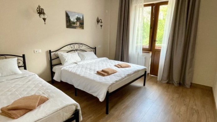 Кондиционер. В номере двуспальная и односпальная кровать, шкаф, столик, санузел (душ, раковина, туалет). С балкона открывается шикарный вид на Бахчисарайские скалы! Есть открытая терраса на втором этаже. Парковка на территории. Возможен заказ завтрака (оплачивается отдельно).