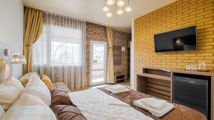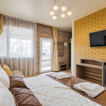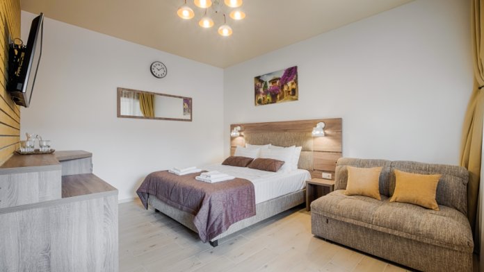 - Стандарт «для Двоих»: с двуспальной совместной кровать с ортопедическим матрасом «Комфорт», мягкий диванчик , для комфортного проживания. В номере: личный санузел с душем, кондиционер, рециркулятор, для снижения риска заражения COVID-19, москитные сетки, смарт ТВ, Wi-Fi, фен, сейф.