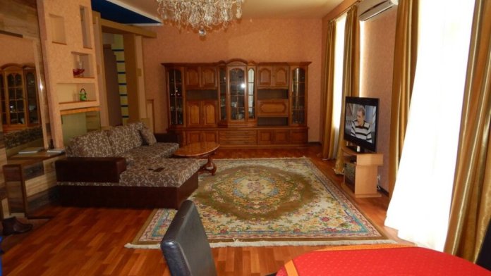 В апартаментах две спальные комнаты. В каждой комнате есть балкон, откуда открывается прекрасный панорамный вид на город, море, восход солнца, салют. Большая двуспальная кровать в каждой спальне. Мягкий раскладной диван с уютными креслами в комнате для гостей. Холодная, горячая вода постоянно.