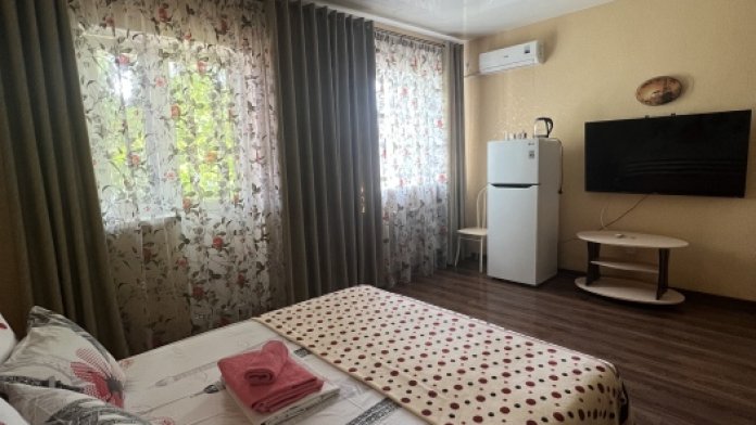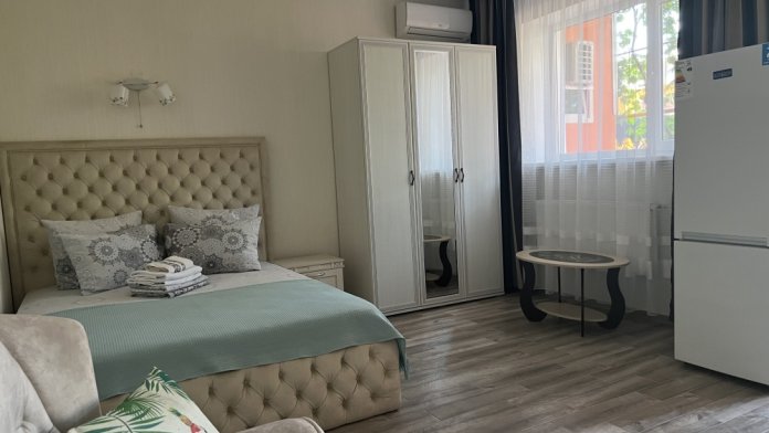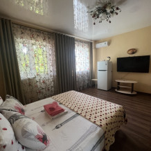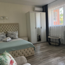 Апартамент «Афродита»- шикарный, просторный, комфортный апартамент. «Афродита» имеет свой отдельный вход, большую спальную комнату, кухню выполненную из дерева, также прихожую и кладовую. Особое внимание хочется уделить ванной комнате, её дизайн выполнен в нежно сиреневый цвет, что даёт ощущения прохлады, чистоты, умиротворения. Имеет своих постоянных клиентов, рекомендуем бронировать не менее, чем за пол года до заезда, чтобы пожить в апартаментах, как Афродита.
