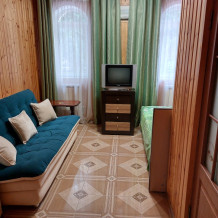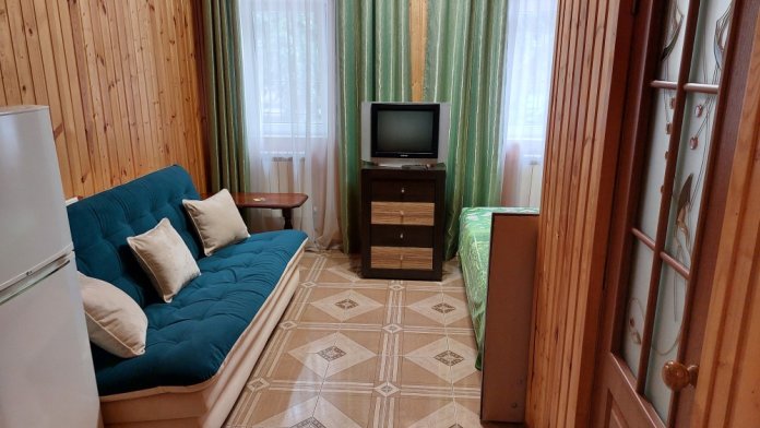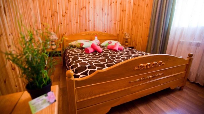 Номер «Деревянный» - название говорит само за себя. Отделка стен выполнена из дерева, экологически чистый и уютный. В номере стоит большой холодильник. Часто бронируют семьи с детьми, номер находится на 1-и этаже, много возвратных клиентов.