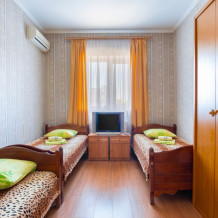 Номер «Твикс» - номер со смыслом. Две палочки твикс, как в шоколадке. Такое название получил, так как здесь установлены две раздельные кровати. Приятный номер, выполненный в спокойных тонах. Имеет интересное название и пользуется спросом, так как один такой в своей категории. Все остальные номера с большими двухспальными кроватями, а здесь две полуторные. Материал из которого сделаны кровати - дуб. Номер находится на втором этаже, напротив номера «Кокос». Часто бронируют семьи: в одной комнате живут родители, другой дети. Душ и туалет общие на два номера, на этаже.