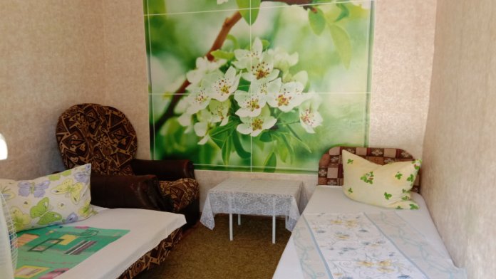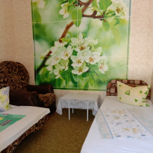 Номер имеет отдельный выход во двор. Под навесом около номера, в тени винограда находится обеденная зона. В номере есть всё необходимое: постельное белье, журнальный столик, комод для белья, плечики для одежды, зеркало, полочки, напольный вентилятор. Полотенца выдаем по требованию. Горячий душ, туалет - раздельные, общие на три номера. На общей кухне есть необходимое оборудование: газовая плита, разделочный стол, мойка, холодильник, посуда.