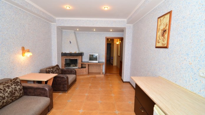 Уютный двухкомнатный номер с прекрасным панорамным видом на море. Комнаты раздельные. Современная мебель: в гостинной - мягкий уголок и кресло, комоды, на балконе - легкая, летняя мебель, 2 телевизора, камин. Санузел в номере (вода постоянно).