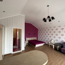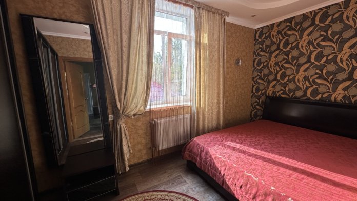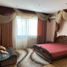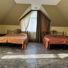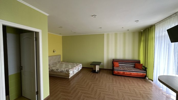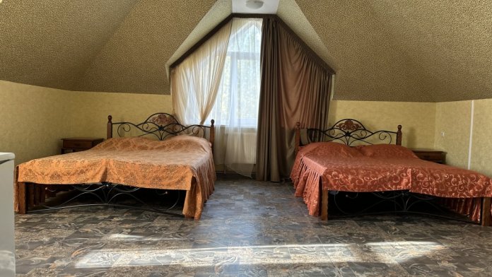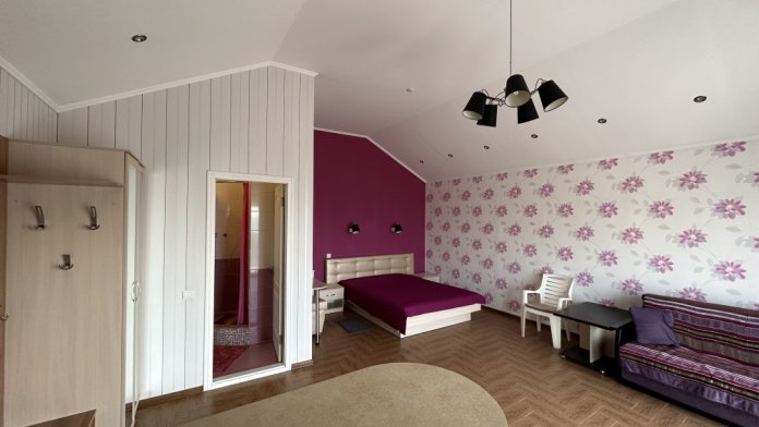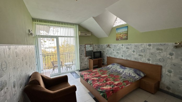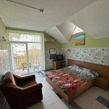 Однокомнатный номер с балконом и возможностью размещения 4-х человек. В номере: две большие кровати, трюмо, телевизор, холодильник, электрочайник, кондиционер. Небольшой кухонный уголок с набором посуды, микроволновкой, чайником и раковиной. Санузел совмещен. Около номера есть уютная беседка и мангальная зона.