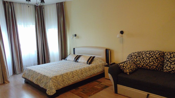 Номер категории Студия оснащен двуспальной кроватью, шкафом, кухней с варочной поверхностью, микроволновой печью, электрическим чайником, холодильником, телевизором, обеденным столом на две персоны, посудой на две персоны. Санузел совмещенный.