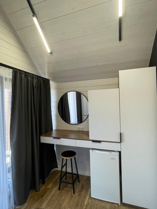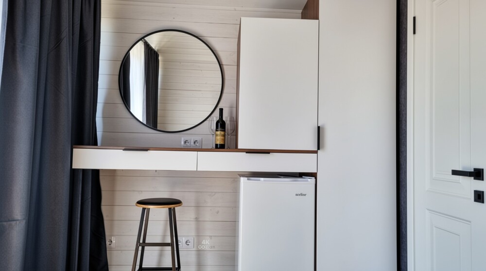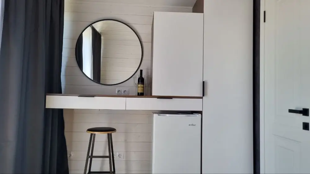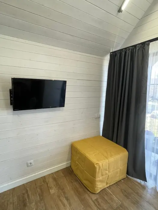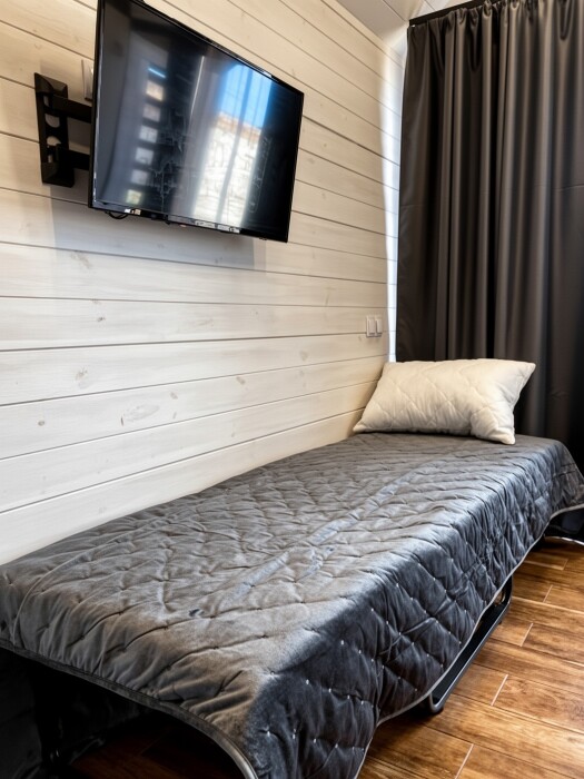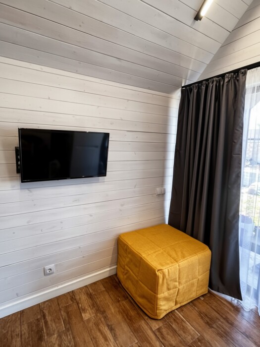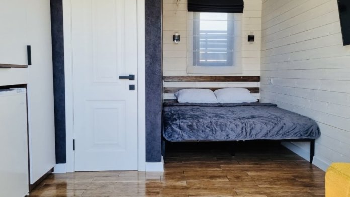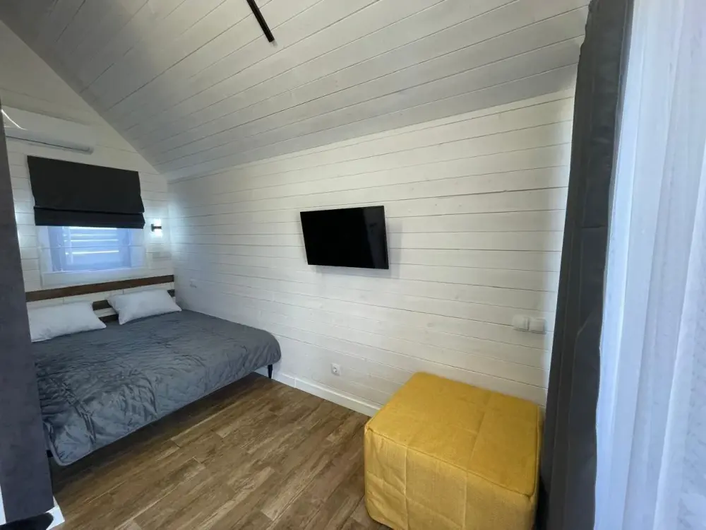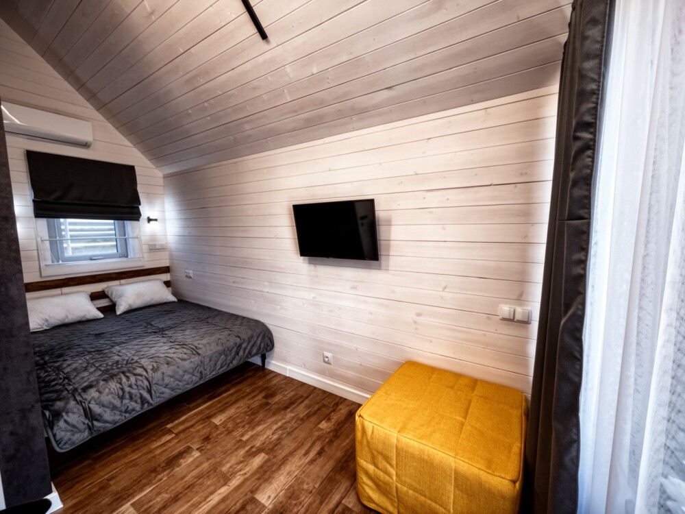 Внутри есть все необходимое: двуспальная кровать (160*200) с ортопедическим основанием и удобным матрасом; индивидуальное освещение для каждого гостя, розетка и полка для гаджета; дополнительная пуф-кровать (80*200) на ортопедическом основании; шкаф-гардероб; рабочее место; собственный санузел (душ, тропический душ, индивидуальный бойлер на 50 л, фен); телевизор с плоским экраном, бокс для входа в свой аккаунт для онлайн приложений и 100 бесплатных каналов; своя терраса с мягкой мебелью (кресло-кокон подвесное, напольное кресло, столик, сушилка для белья, индивидуальный свет).