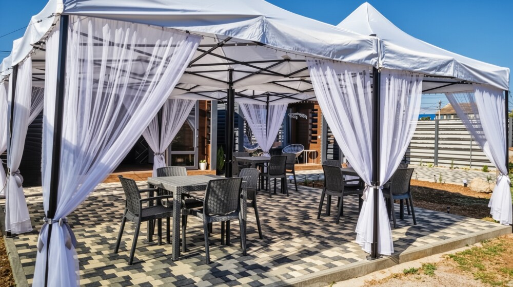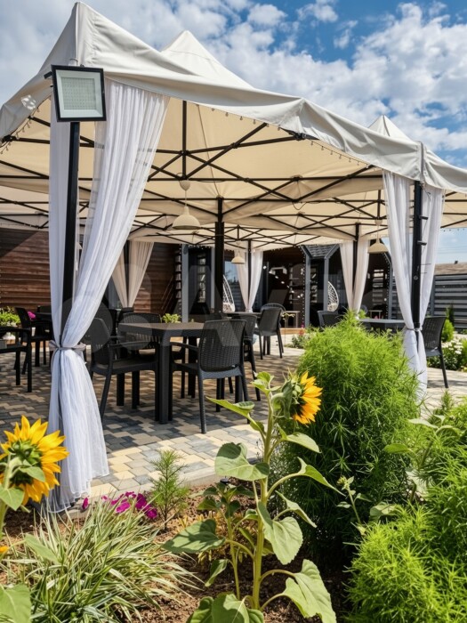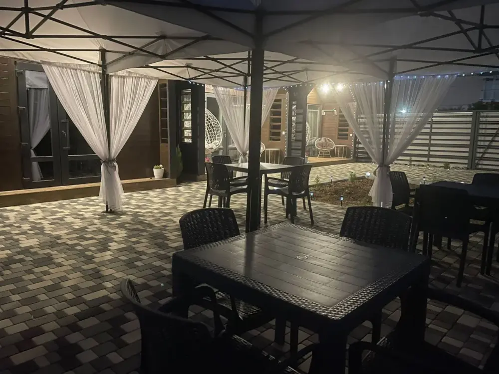 Зона с шатрами оборудована всем необходимым для приема пищи: 4 комплекта уличных столов со стульями, пол выложен брусчатым кирпичом, вечерняя подсветка для уютного вечера.
