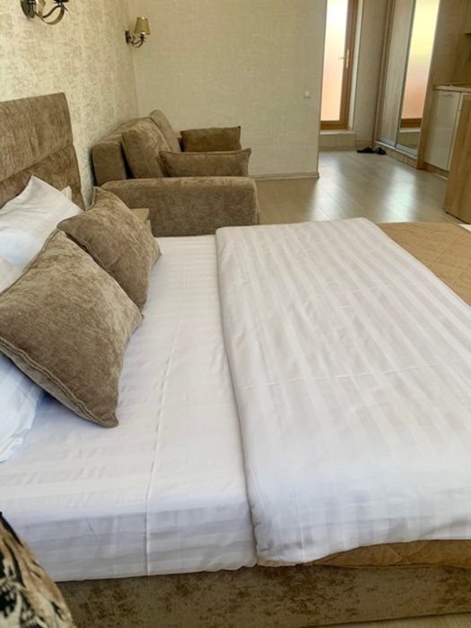 Двуспальная кровать и двуспальная кровать-диван. В номере туалет, душ, кондиционер, телевизор, холодильник.