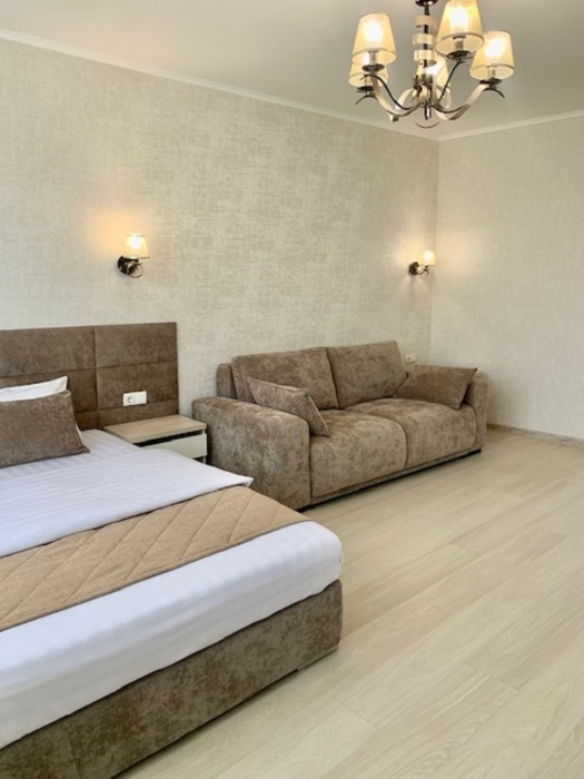 В номере: туалет, душ, кондиционер, два телевизора, холодильник. Wi-Fi - (роутер рядом с номером). Из мебели: кровать двуспальная, 2 дивана двуспальных, две прикроватных тумбочки, тумбочка для телевизора, пенал для белья, внутренний шкаф для чемоданов, сумок. Рабочий стол для компьютера, журнальный столик, парфюмерный столик. Кухня на этом же этаже, рядом с номером (на три семьи,), где находится вся не обходимая посуда, для приготовления пищи, микроволновка, газовая плита.