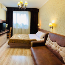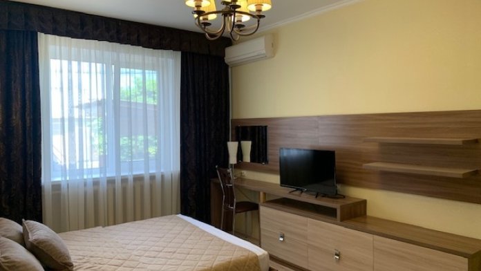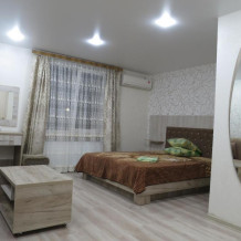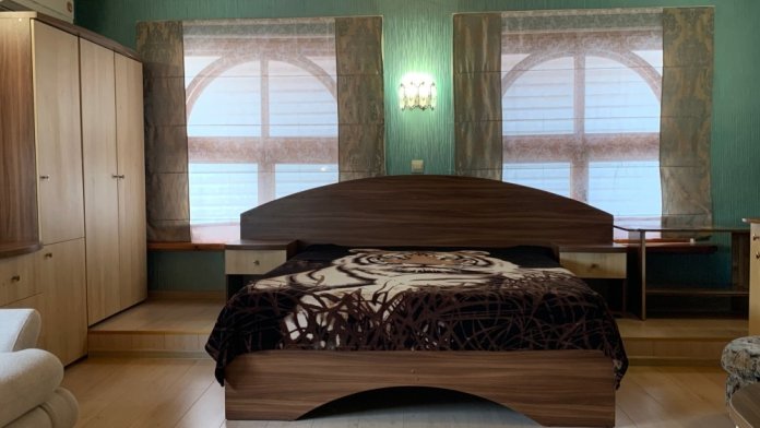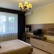 Номер на первом этаже, большое окно выходит на улицу, на окне решетка. Четыре спальных места. Двуспальная кровать и мягкий двуспальный диван. В номере туалет, душевая кабинка. Из техники: кондиционер, телевизор, холодильник утюг. Из мебели: платяной шкаф, парфюмерный столик, тумбочки под телевизор, два журнальных столика, стулья. Кухня в номере: имеет вытяжку, электроплитку, СВЧ-печь, посуда вся не обходимая - для готовки завтраков, обедов, ужинов, электрочайник, столик.