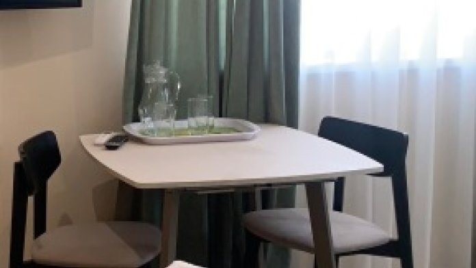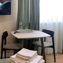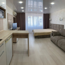 Из мебели: платяной шкаф, парфюмерный столик, тумбочки под телевизор, два журнальных столика, стулья. Кухня в номере: имеет вытяжку, электроплитку, СВЧ-печь, посуда вся не обходимая - для готовки завтраков, обедов, ужинов.