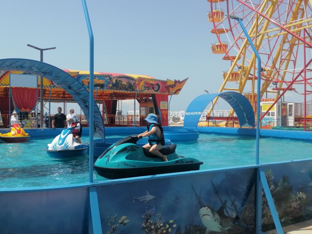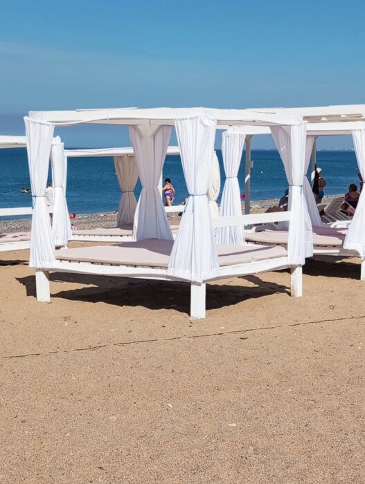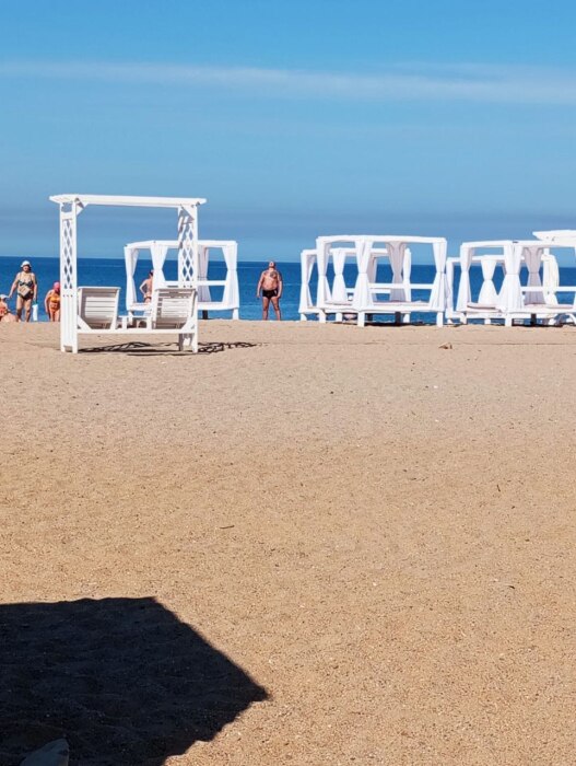 Пляж широкий - около 10 0м в ширину, а в длину около 1 км. Оборудован всем необходимым для хорошего отдыха (шезлонги, навесы, парк аттракционов, как для детей так и для взрослых).