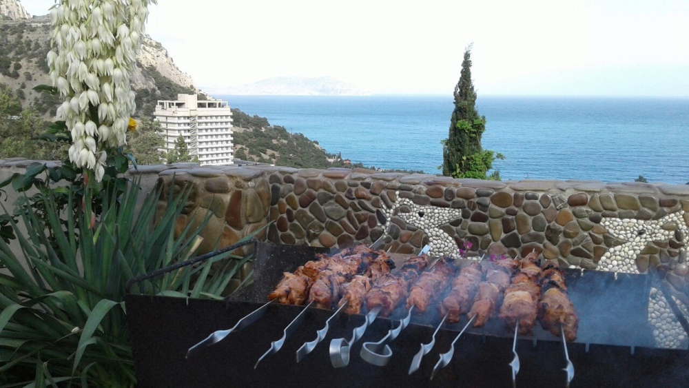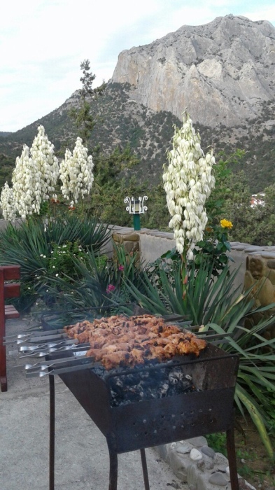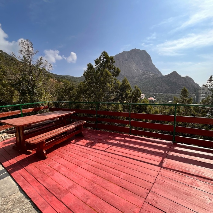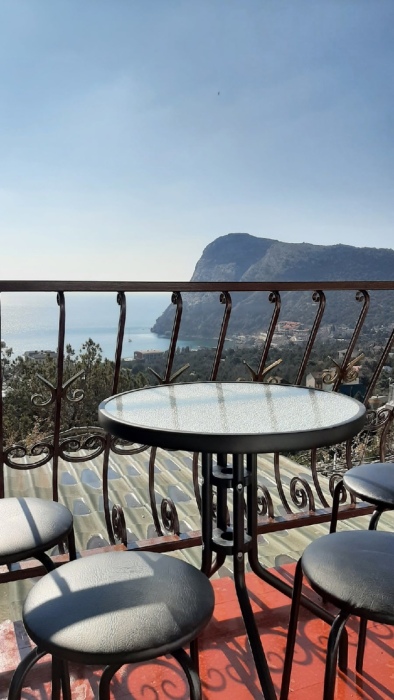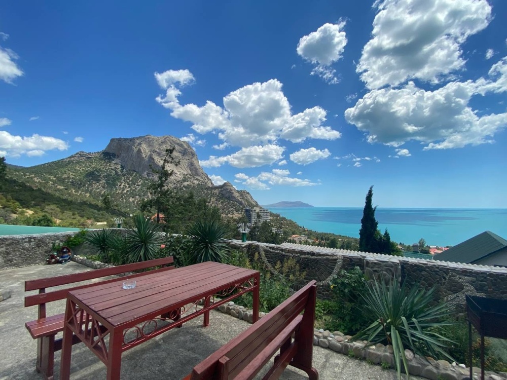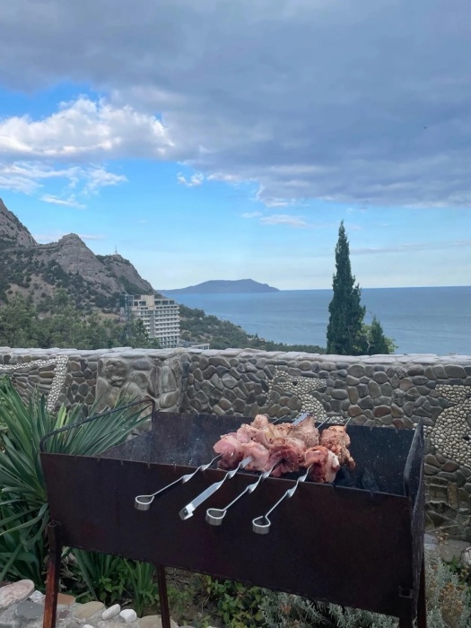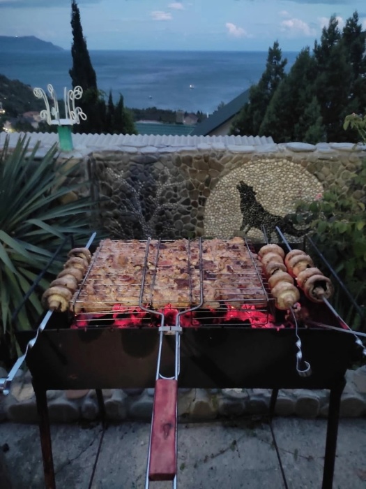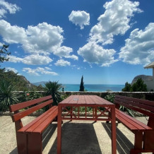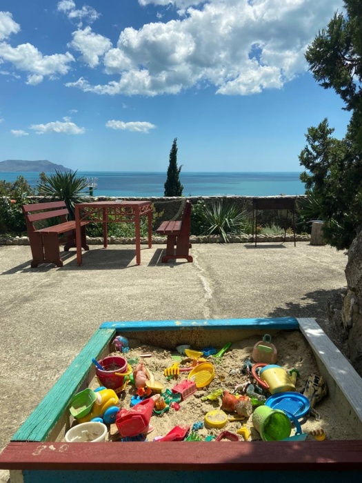 Большой двор под ключ, просторная терраса с видом на море , место для приготовления шашлыка, песочница для детей, место для парковки.