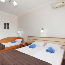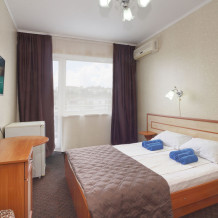 Однокомнатный номер общей площадью 20 кв.м., оформленный в традиционном стиле. В номере есть все необходимое для комфортного проживания: двуспальная кровать и односпальная (или три односпальные) с удобным матрасом, балкон, шкаф для хранения одежды, прикроватные тумбы, холодильник, ЖК-телевизор, сплит-система, собственная ванная комната с душевой кабиной и туалетными принадлежностями, набор для приготовления чая/кофе. Вид из номера на город и горы. Номера расположены на 3, 4 и 5 этажах.