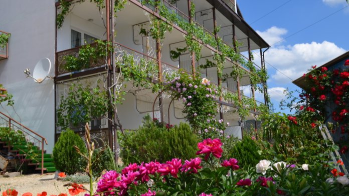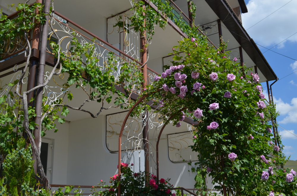 Наш небольшой гостевой дом «Терем*ОК», увитый виноградом, имеет зеленую территорию с розарием и альпийской горкой. Он расположен в центре поселка во 2-1 линии от моря (700м) – это позволит отдохнуть в тишине в вечернее и ночное время. Дорога к набережной займет 10-12 минут и проходит мимо рынка, магазинов, торговых палаток, через парк Дома творчества писателей «Коктебель».