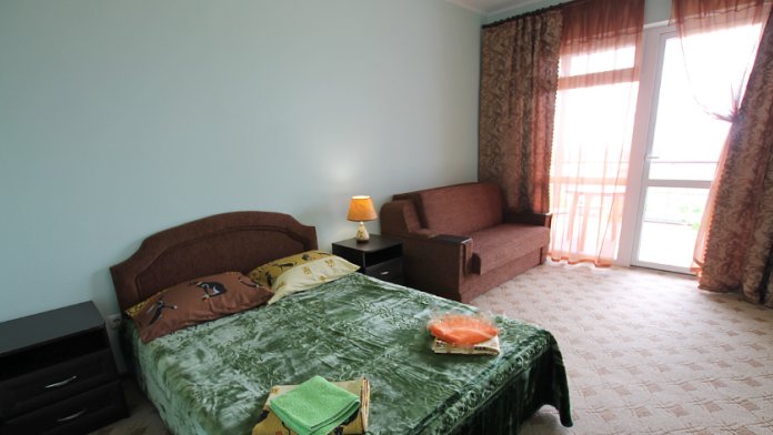 В однокомнатном номере есть большой балкон, увитый виноградом, где Вы можете отдохнуть и покушать в тени. Мягкая мебель: двуспальная кровать и диван. Прикроватные тумбочки. Красивое постельное белье, полотенца, посуда. Бытовая техника: кондиционер, холодильник, бойлер, ж/к телевизор, спутниковое ТВ, электрочайник, интернет wi-fi. Санузел: душ, раковина, унитаз. Холодная и горячая вода круглосуточно. Туалетные принадлежности: мыло, бумага.