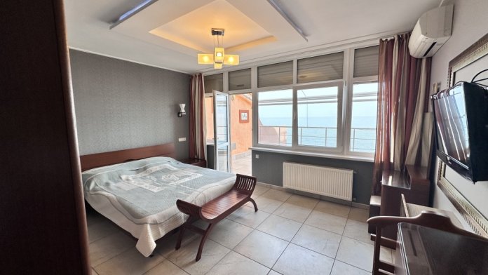 Апартаменты расположены на пятом этаже, поэтому из них Вы сможете любоваться панорамными видами на море. Планировка включает: две спальные комнаты (одна спальня с двуспальной кроватью, вторая – с раскладывающимся диваном), два совмещенных санузла (один из них в спальне); кухню-гостиную с угловым диваном (раскладывается) обеденным столом и барной стойкой; просторную лоджию площадью 35 кв.м., которая станет для Вас классной лаундж-зоной, где Вы сможете наслаждаться морским бризом в полном спокойствии и тишине. Установлены автоматические роллеты. В апартаменте выполнен качественный ремонт, оснащён хорошей мебелью и техникой. Коммуникации: электричество, вода, канализация. Установлена система теплый пол.