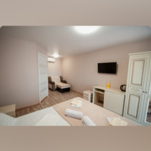 Номер отлично подойдет для молодой семьи с ребенком, в номере есть дополнительное место для ребенка, а так же, в гостинице имеется детская кроватка для малышей. Номер оснащен шкафом и комодом для одежды и белья, и сушилкой для одежды на террасе.