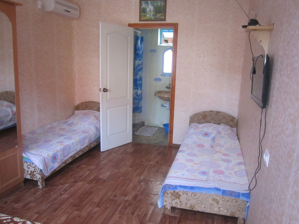 Дом с индивидуальным входом в каждую комнату. В каждой комнате санузел, кондиционер, телевизор, двуспальная кровать, шкаф, диван-книжка, в доме горячая, холодная вода круглосуточно,