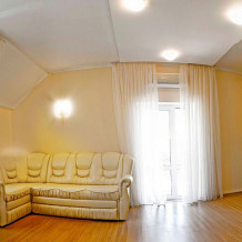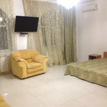 В номере есть кухня с посудой, шкаф-купе, тумбочки, стол со стульями. Стиральная машина в коридоре на три люкса. Смена белья и уборка по графику.