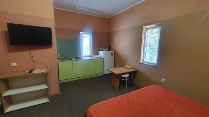 Номер находится в гостевом доме, расположенном в городе Фодосия, на берегу моря, на Черноморской набережной на расстоянии 50 метров от кромки воды. Номер оборудован кухней для самостоятельного приготовления еды. Закрытй большой зеленый двор, есть стоянка для авто. Для номера предусмотрена своя отдельная беседка во дворе, с набором пластиковой мебели для отдыха.
