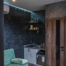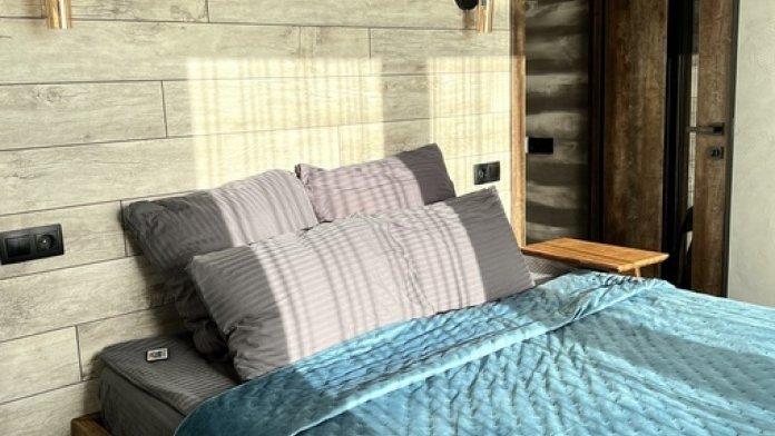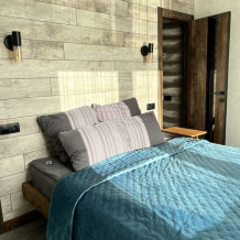 Вместительный двухкомнатный домик с новейшим стильным дизайном. В первой комнате Вас ждет мини кухня со всем необходимым для приготовления завтрака обеда и ужина, а так же удобный диван и журнальный столик для отдыха. Вторая комната - спальная зона с большой двухместной кроватью и выходом на террасу.
