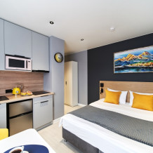 - В номерах с кухонной зоной: кофемашина, варочная панель, фильтр для воды.
