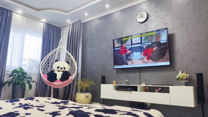 В каждой комнате имеются японские кондиционеры, большие плазменные телевизоры Самсунг нового поколения 4к 55 диагональ со смарт ТВ, вай-фай. Имеется домашний кинотеатр Sony с акустической системой, стиральная машина 3д Lg с встроенной сушкой. Варочная поверхность, духовой шкаф, холодильник, пароутюг, соковыжималка, и другая техника фирмы Bosch, вся техника из чёрного стекла, контрастно сочетающаяся с белой глянцевой кухонной мебелью. Имеется система очищения воды Osmos. Мягкие пудровые велюровые кресла и шторы на кухне также сочетаются с декоративным камнем и декоративной штукатуркой, на которой пикантно смотрятся большие настенные часы.