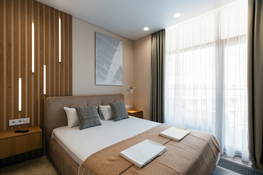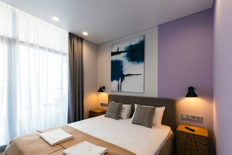 Комфортные двухкомнатные апартаменты в элегантном дизайне, каждый с балконом и видом на море. Отдельная спальня с двуспальной кроватью и пространство гостиной с диваном (раскладывается) и кухонной, обеденной зоной. Оснащение номера и мебель: рабочее пространство, шкаф, сушильная машина, утюг.