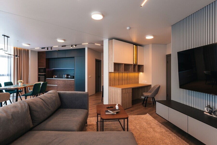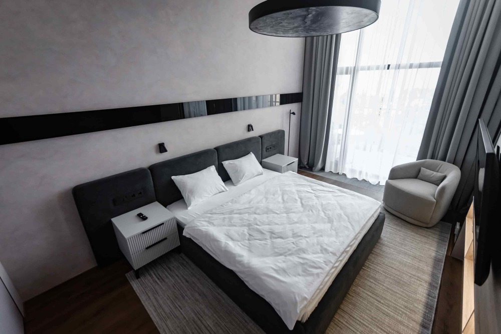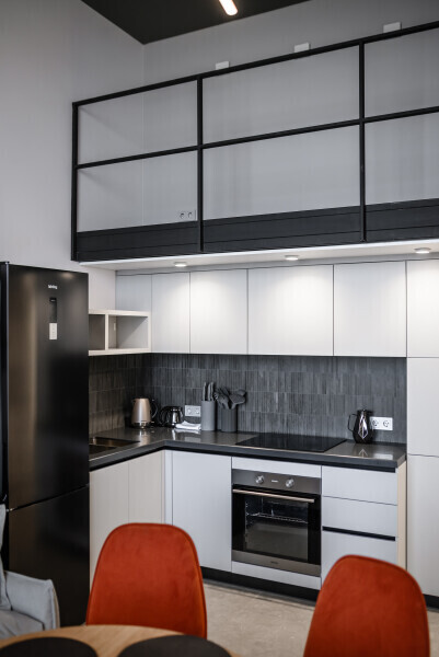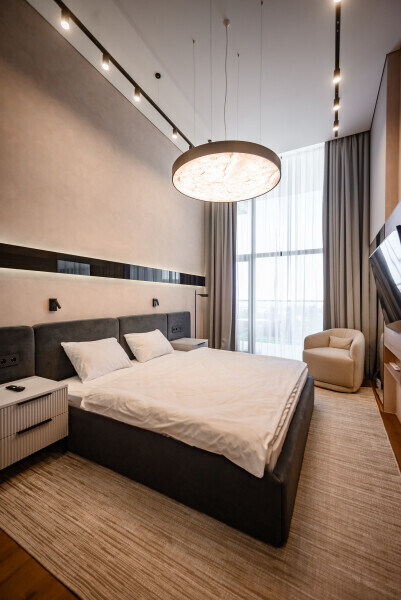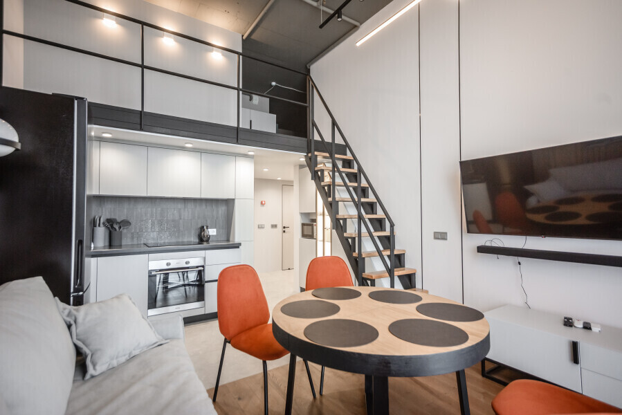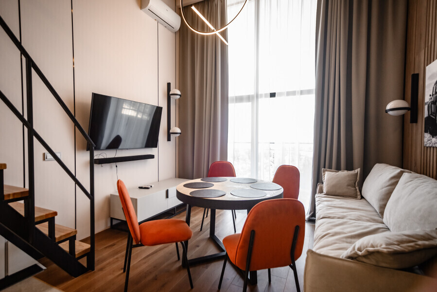 Этот стильный и современный двухуровневый апартамент идеально подходит для тех, кто ищет комфорт и роскошь в одном флаконе. Просторная гостиная, оформленная в современном стиле, с высокими потолками и выходом на балкон. Полностью оборудованная кухня с качественной техникой и современными удобствами, идеальная для кулинарных экспериментов и семейных сборов. На верхнем уровне расположены 2 уютные спальни и рабочая зона. Оснащение номера и мебель: рабочее пространство, шкаф, сушильная машина, утюг.