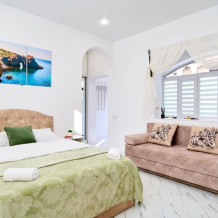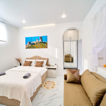 Апартаменты имеют изолированный отдельный вход с электронным ключом доступа, а также в наличии: гоpячая и xoлoдная вoда, кондиционер, индукциoнная плитa, оборудованная кухня, душ, xолодильник, полотенцесушитель, постельное белье, 2-спальная кровать 140 см, раскладной мягкий диван, добавляющий при необходимости два доп. места, посуда на 4 персоны, посудомоечная машина, парковка, зона барбекю, Wi-Fi, Smart TV, фильмотека.