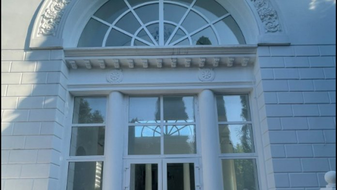 Здание 2-этажое, с открытыми балконами, в стиле ампир, архитектурная достопримечательность.
