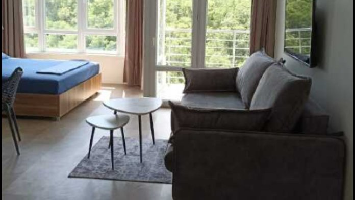 Апартамент со своим балконом, кухней и санузлом. Есть все необходимое для комфортного проживания: двухспальная кровать с ортопедическим матрацом, диван, телевизор, шкаф, кондиционер-инвертор, фен, Wi-Fi, холодильник, духовой шкаф, посудомоечная машинка, микроволновая печь, чайник, электроплита, на кухне вся необходимая посуда, стиральная машина с гладильной доской и утюгом, санузел оснащен теплыми электрическими полами. Балкон оснащён стульями и столиком.