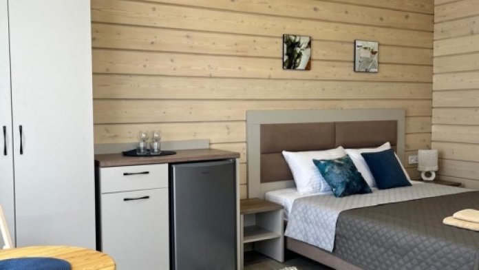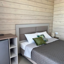 Двухместный номер с оборудованной кухней и обеденной зоной расположен на первом этаже. Небольшая панорамная терраса на входе ,с видом на территорию оборудована комплектом складной мебели из дерева.
