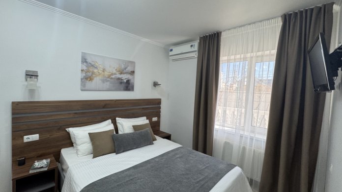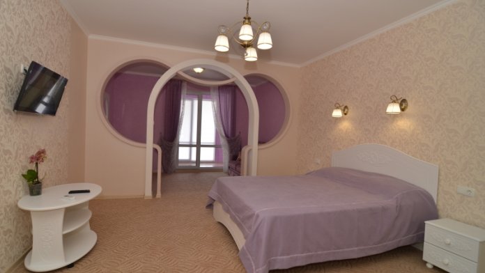 В номере есть прикроватные тумбочки, мягкая мебель, стулья, комод, необходимый набор посуды, вместительный шкаф, сейф, Wi-Fi зона, два телевизора.