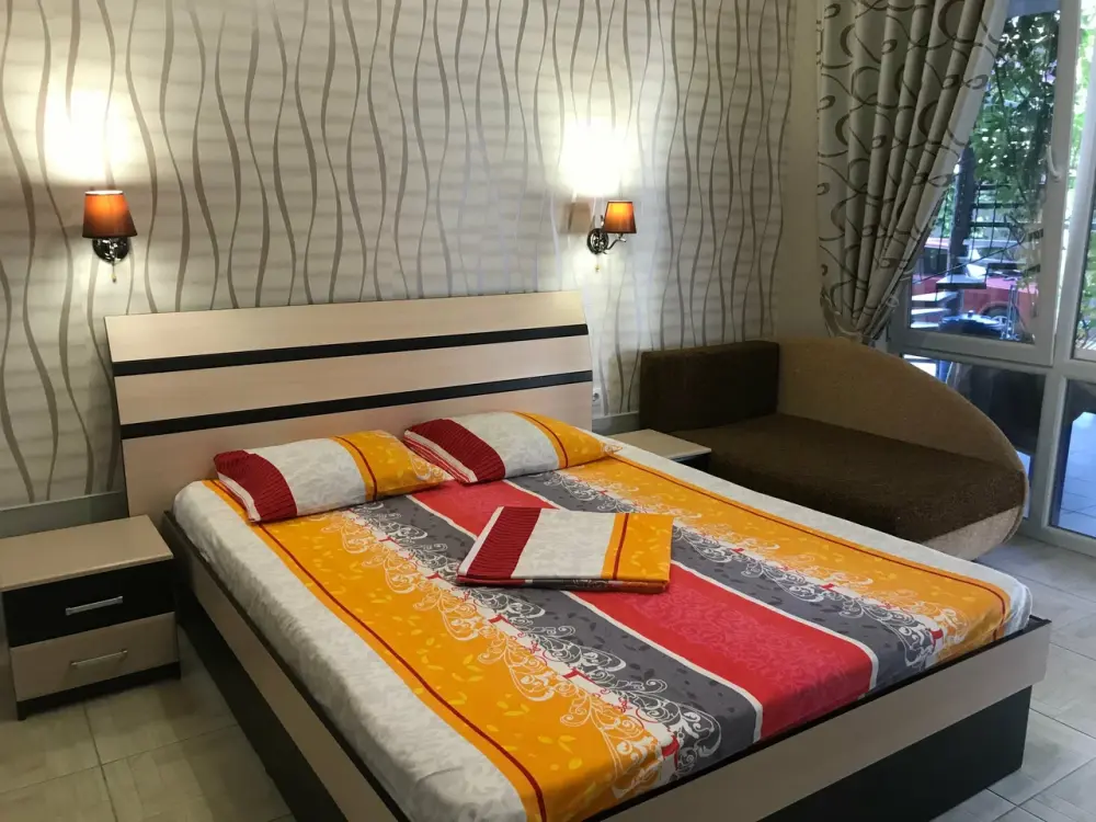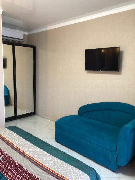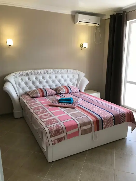 В апартаментах: 2-спальная кровать, раскладной диван, душ и санузел (горячая и холодная вода круглосуточно), телевизор, холодильник, кондиционер, wi-fi. Отдыхающим предоставляем полотенца и постельное белье.
