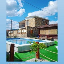 Номер двухкомнатный повышенной комфортности, кухня (полностью оборудована техникой и всей посудой), с/у, душ, горячая и холодная вода постоянно, тв в каждой комнате, беседка, мангал, автостоянка, бассейн с подогревом и детской зоной. Газовое отопление.