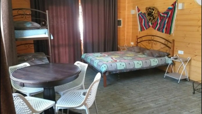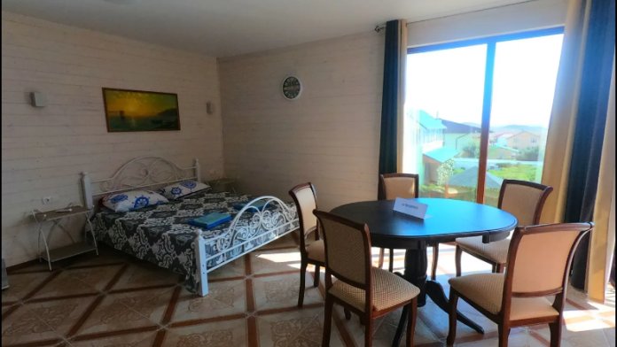 Двухместный номер с двуспальной кроватью. Саеузел и душ на два номера. Летняя кухня с полным набором посуды и техники, Стоянка и бассеин(подогреваемый) с детской зоной-бесплатно. Баня на дровах (платно).