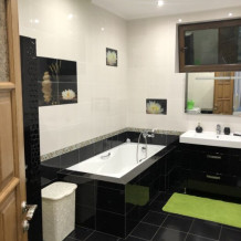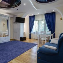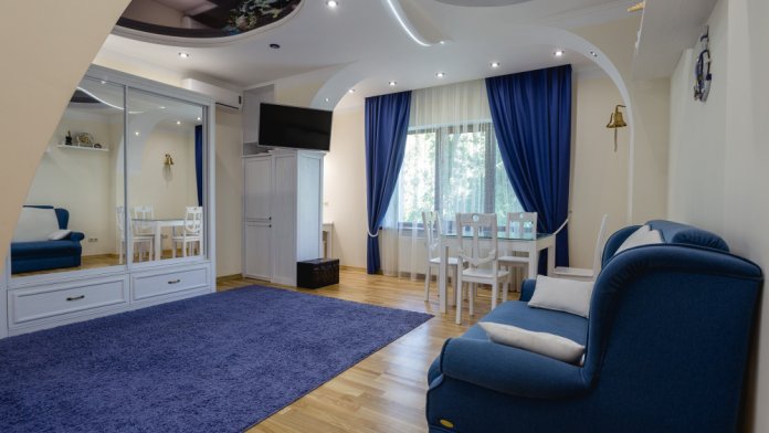 Номер стилизован, тематика «морская»; также в номере прикроватные тумбочки, платяной шкаф, стол, стулья, витринный стол, СВЧ, индукционная печь, кухонный гарнитур; просторный санузел.